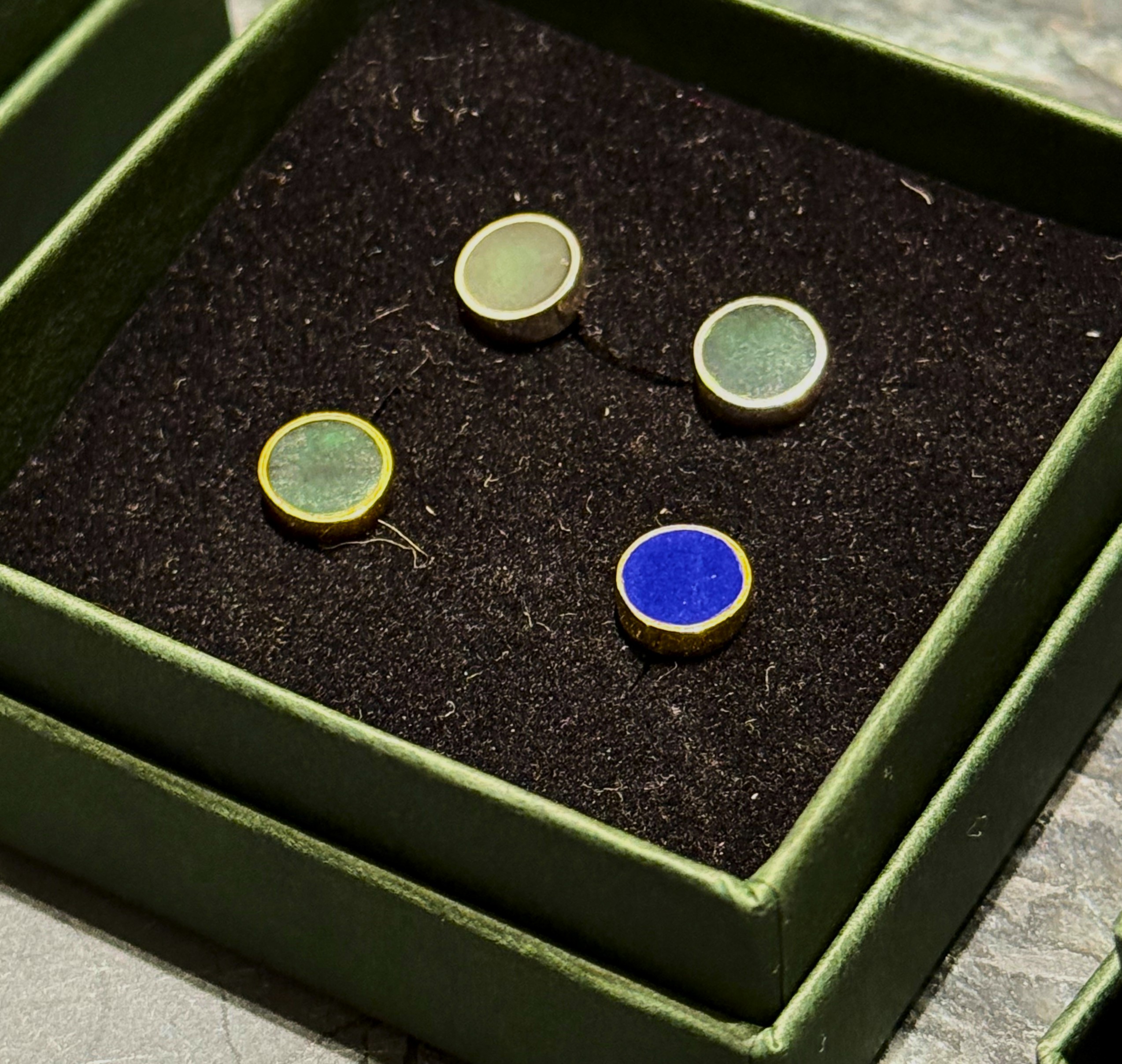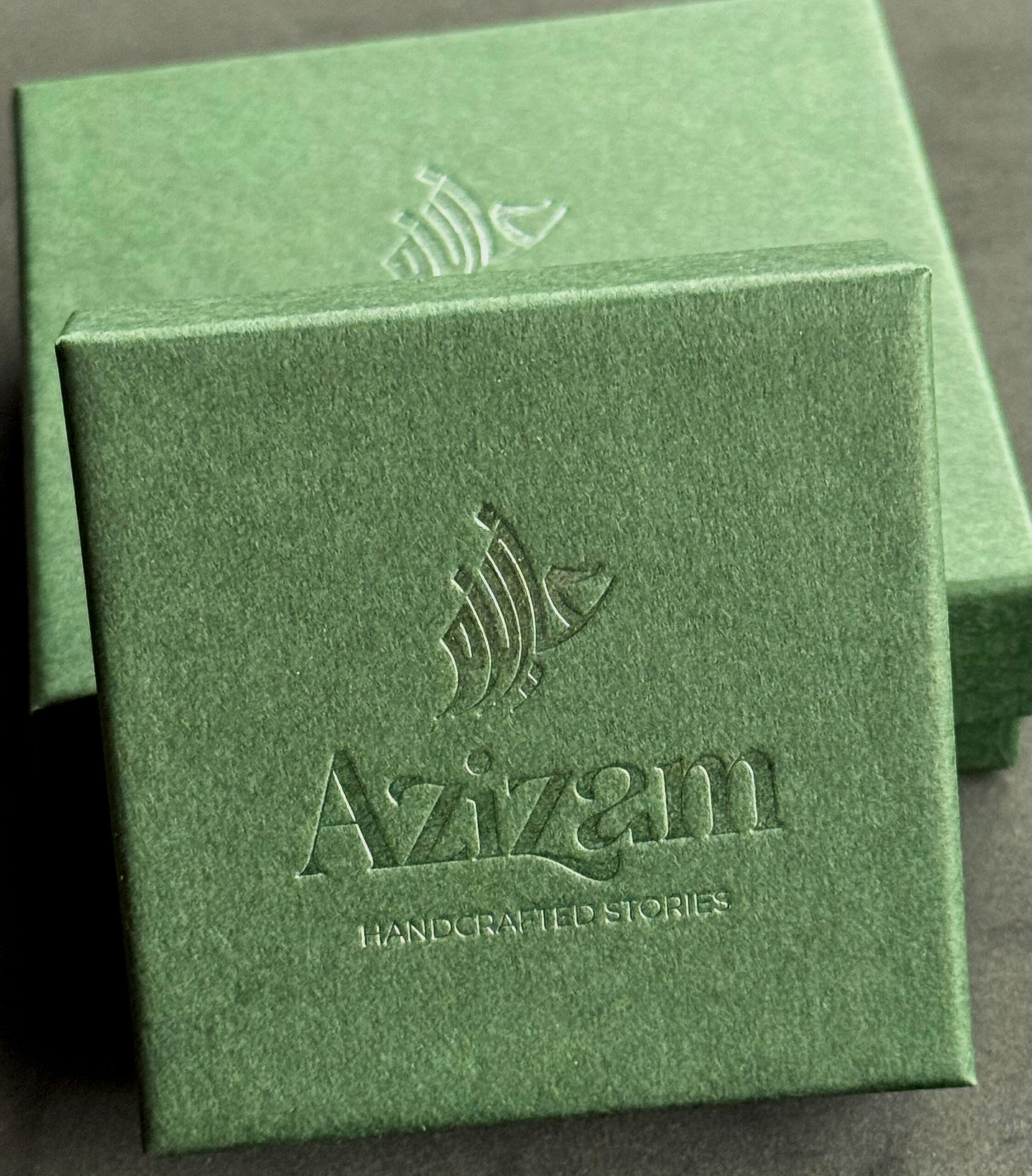 Øreringene bliver leveret i en lille mørkegrøn Azizam æske.