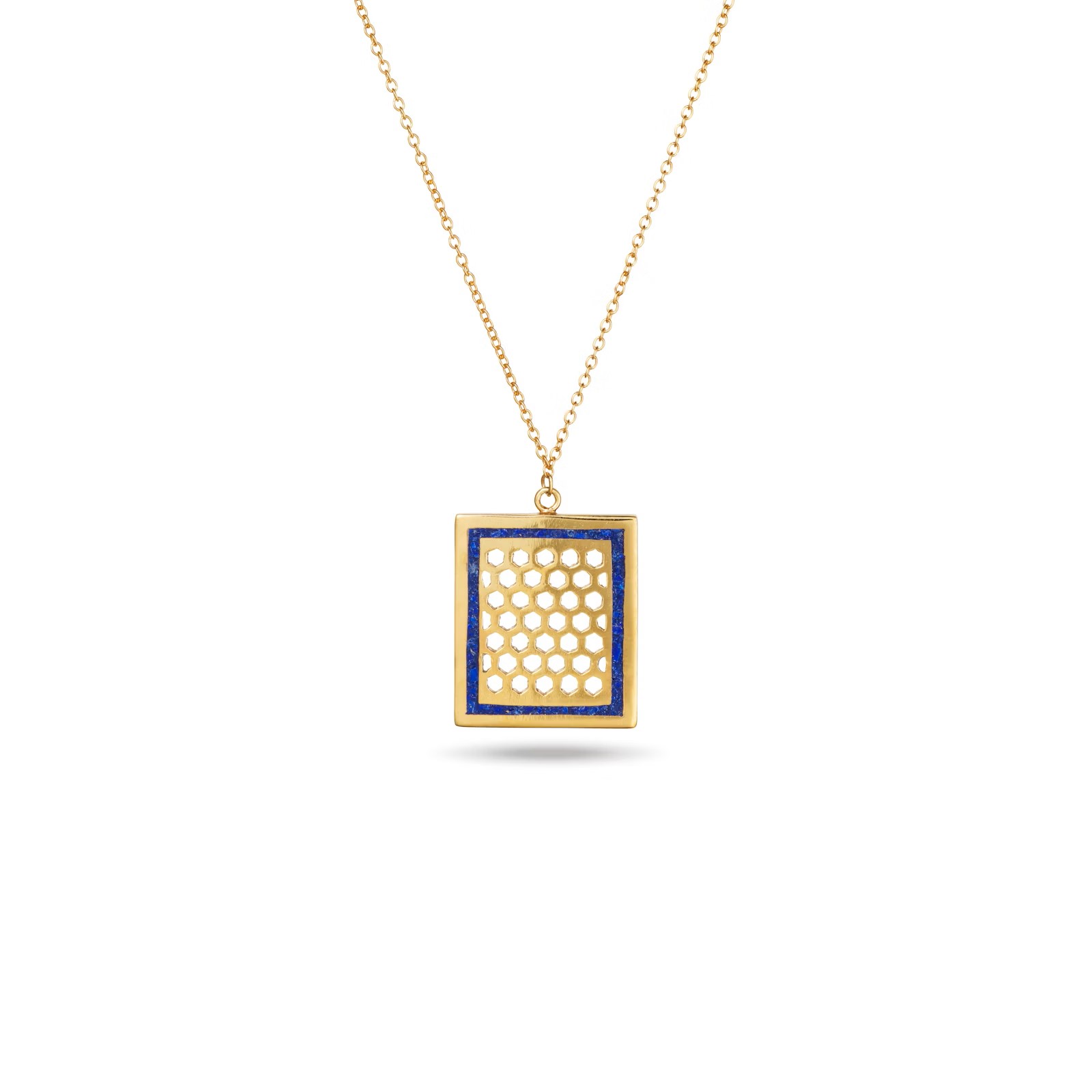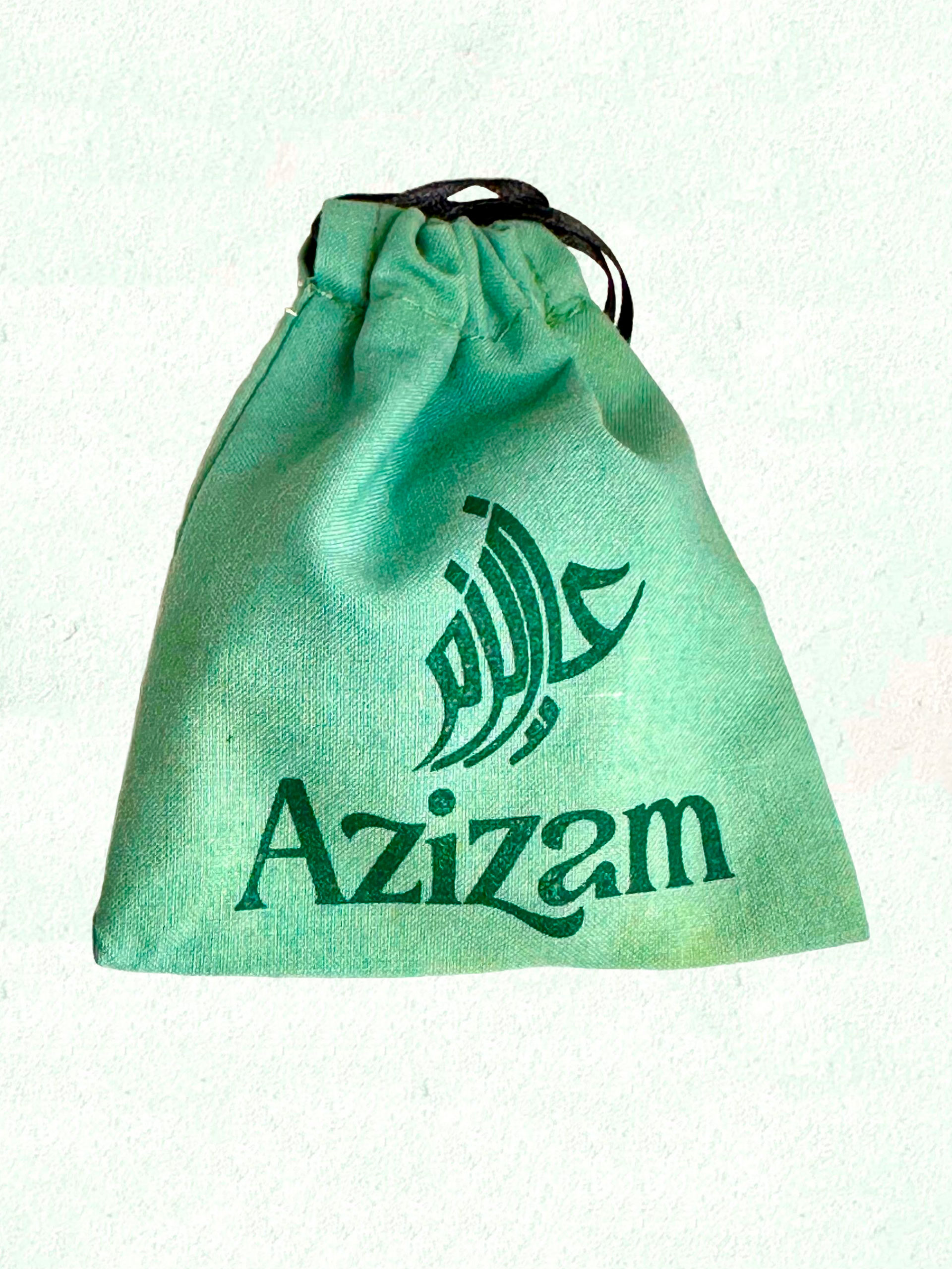 Halskæden bliver leveret i en grøn Azizam pose fra genanvendt bomuld. Posen er håndlavet af udsatte kvinder i København. Læs mere her