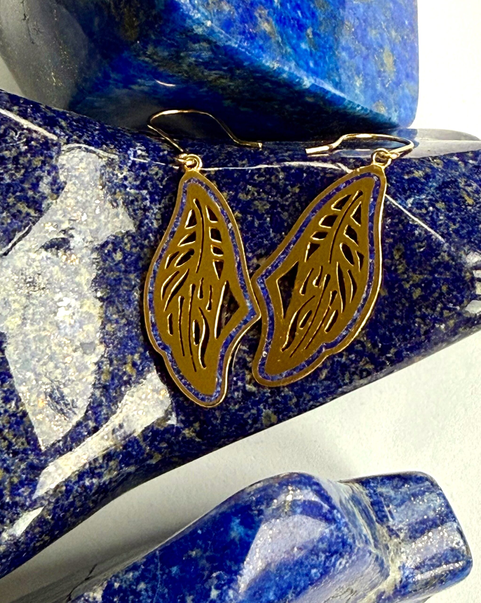 Disse blad øreringe har en tidløs blå lapis-lazuli kant, der giver dem et helt særligt udtryk. Det moderne og traditionelle sammensmelter i et unikt design.