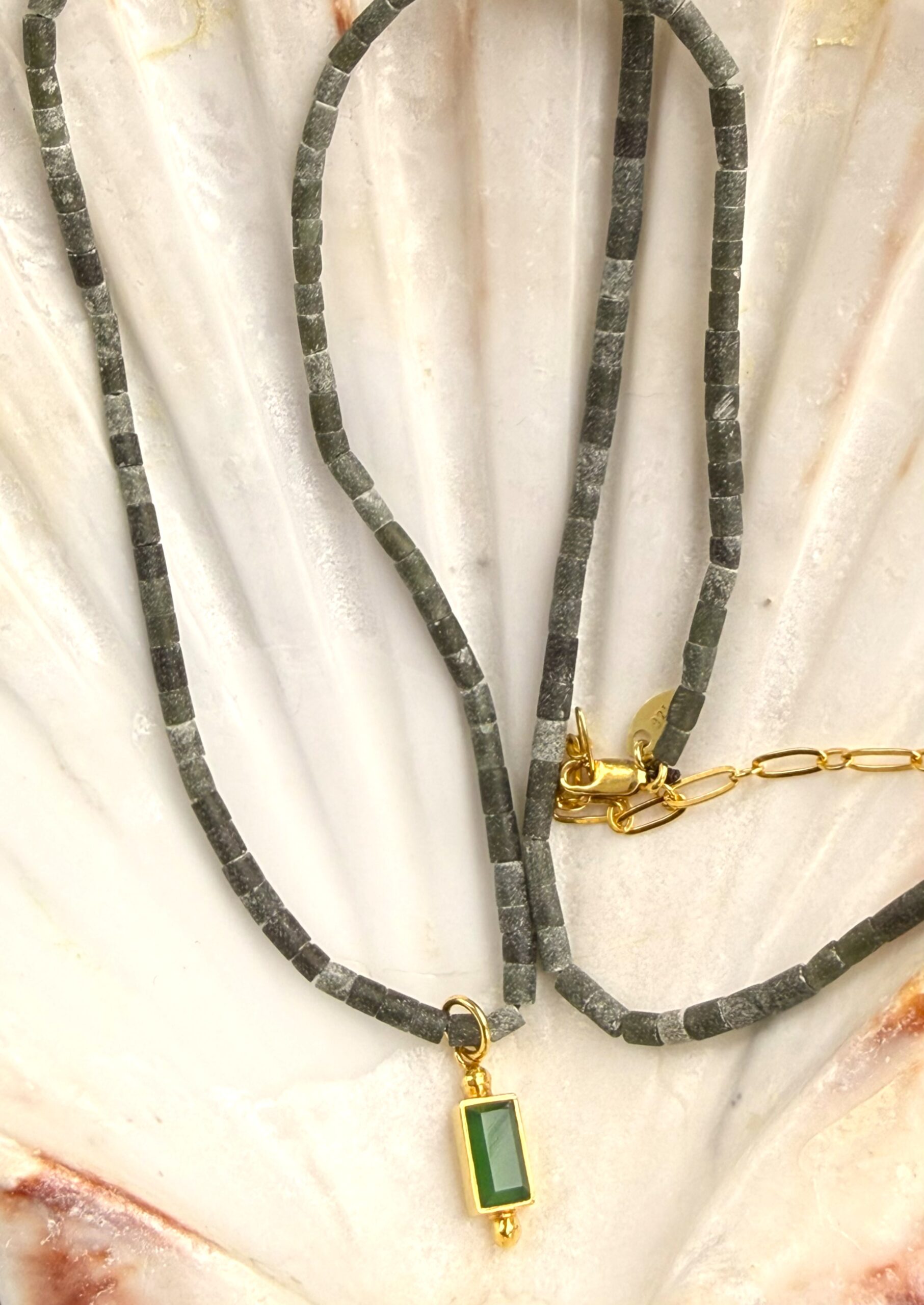 Stilrent grønt agat vedhæng i en unik kæde lavet af bittesmå grønne jade nefrit sten. Kæden kan justeres i længde og bruges med eller uden vedhæng.